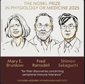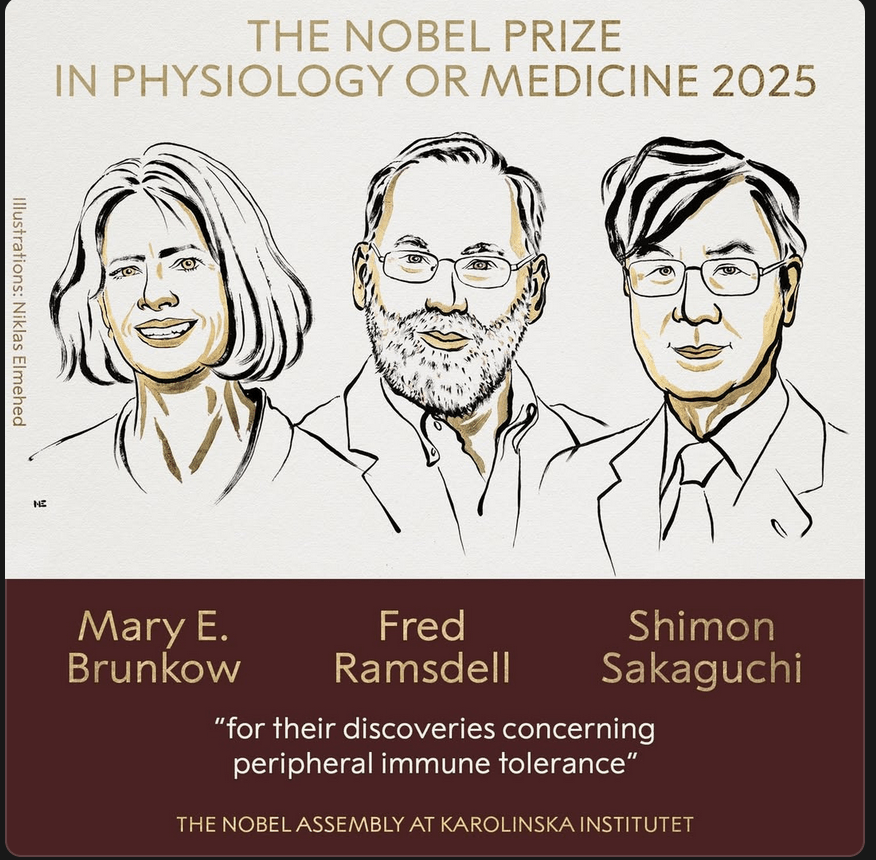 The 2025 Nobel Prize in Physiology or Medicine has been awarded to Mary E. Brunkow, Fred Ramsdell, and Shimon Sakaguchi (Figure 1) for their landmark discoveries revealing how the immune system maintains self-tolerance, the ability to recognize and spare the body’s own tissues while targeting pathogens and cancer. Their work uncovered the mechanisms by which immune regulation is achieved through regulatory T cells (Tregs) and the gene FOXP3, transforming our understanding of immune control and paving the way for new treatments in autoimmunity, cancer, and transplantation medicine.