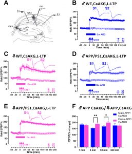 Figure 1: CaAKG ameliorates impaired LTP in APP/PS1 mice with a more profound effect in APP/PS1 females compared to males. (A) Schematic representation of a transverse hippocampal slice with electrodes located in the CA1 area of hippocampus. Recording electrode represented as ‘rec’ is located in CA1 apical dendrites, flanked by two stimulating electrodes S1 and S2 placed in the stratum radiatum (sr) layer to stimulate two independent synaptic inputs to the same neuronal population in the Schaffer collateral (sc) synapses of hippocampus. (B) STET in S1 in presence of CaAKG resulted in a significant potentiation that was maintained for 4 h in male WT mice. CaAKG was bath applied for 60, 30 min before and 30 min after STET. The STET in S1 (blue filled circles) resulted in a significant potentiation that maintained for 4 h, whereas the control potentials in S2 (blue open circles) remained stable throughout the recording (n = 9). (C) STET in S1 in female WT mice in the presence of CaAKG also resulted in a potentiation that maintained for 4 h. STET in S1 (pink filled circles) resulted in a long-lasting LTP for 4 h, whereas the control input S2 (pink open circles) remained stable throughout the time course of recording (n = 5). (D) When STET was delivered to S1 (blue filled circles) in male APP/PS1 mice in presence of CaAKG, it resulted in a long lasting LTP. (n = 8). (E) STET in S1 (pink filled circles) in presence of CaAKG in female APP/PS1 mice also resulted in a long lasting LTP that persisted for 4 h (n = 8). (F) Bar graphs shows comparison of fEPSP values of S1 from male APP/PS1 and female APP/PS1 treated with CaAKG (D, E) at 1, 5, 50-, and 240-min post STET. Blue bars represent the values from male APP/PS1 and pink bars represents value from female APP/PS1 mice. Control stimulation of S2 in B, C, D and E showed stable potentials for the recorded time period (blue and pink open circles). Three solid arrows represent the time of induction of late-LTP by STET. Solid horizontal bars represent the time period of application of CaAKG. Error bars in all graphs indicate ± SEM.