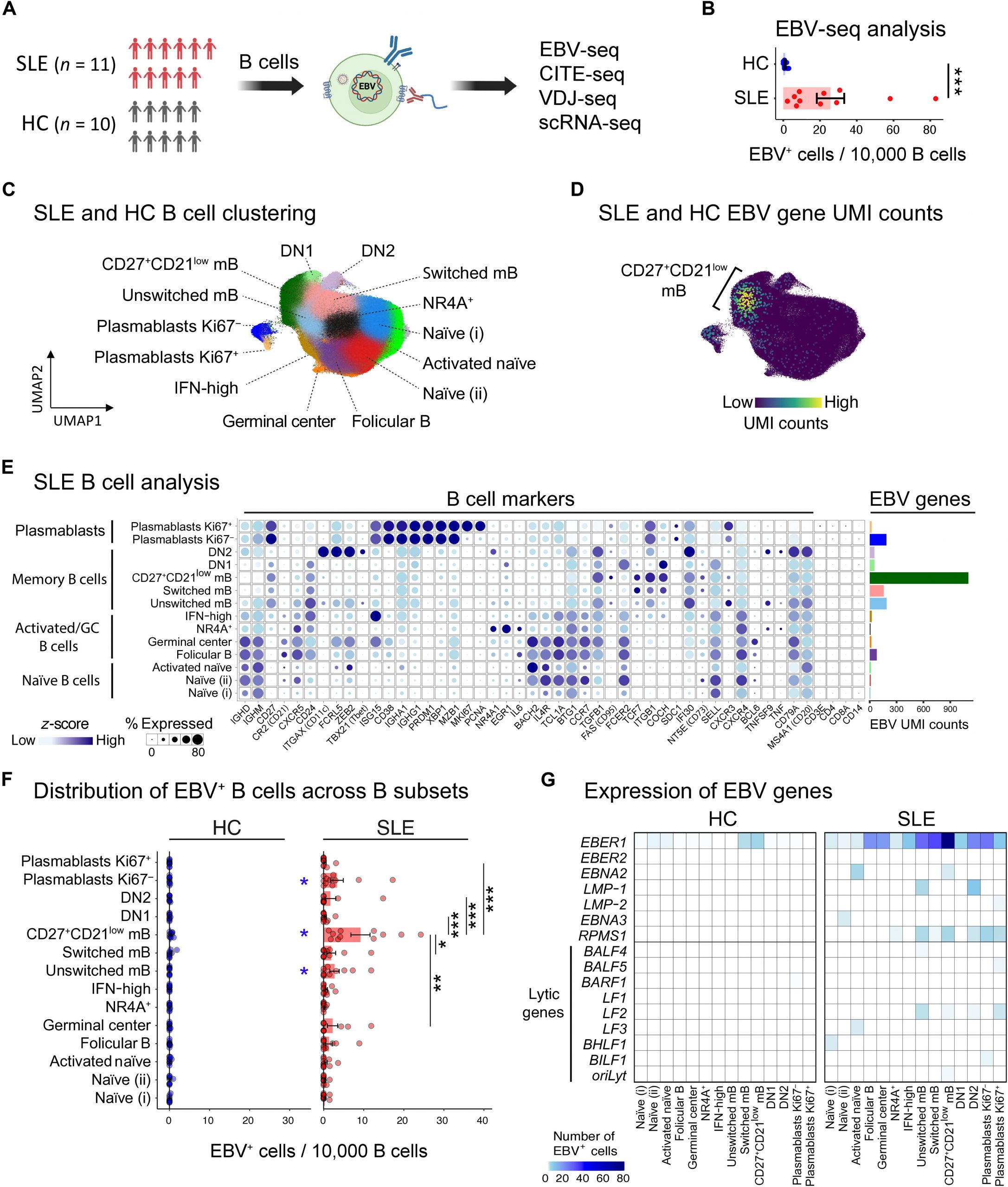 Figure 1: EBV-seq enables identification of EBV-infected B cells. (A) An EBV-seq primer design was incorporated into a 10x Genomics bead-based scRNA-seq workflow that included CITE-seq performed using oligonucleotide-barcoded Abs specific for the prototypical markers for B cell subsets. BCR sequencing was performed by analysis of the expressed variable diversity and joining (VDJ) immunoglobulin genes, followed by analysis of immunoglobulin heavy (H) and light (L) chain gene expression. (B) Shown is the EBV genome annotated with the EBV genes (blue font) and small noncoding RNAs (green font) for which primers were included in EBV-seq. (C) Comparison of standard 10x Genomics scRNA-seq with EBV-seq 10x Genomics scRNA-seq for detection of EBV+ B cells in a PBMC sample from a patient with SLE; EBV UMI counts are represented by intensity of brown dots. ADT, antibody-derived tag.