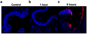 Figure 1: Deposition of complement (C3) in murine cervical tissue after LPS administration. Representative 40× immunofluorescent imaging of C3, captured at different timepoints following LPS administration; no quantitative analysis performed. (a) Naïve cervical tissue showing minimal C3 deposition. (b) Cervical tissue collected 1 h after LPS administration showing minimal, but increased C3 deposition compared to naive control tissue. (c) Cervical tissue collected 9 h after LPS administration showing increased C3 deposition compared to both naive control and 1 h post-LPS administration tissue.