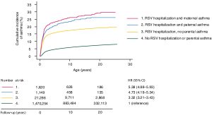 Figure 1: Cumulative incidence of asthma according to RSV hospitalization during infancy and parental asthma status. Kaplan-Meier curves showing cumulative incidence of asthma by hRSV hospitalization during infancy and parental asthma status. Cox regression models adjusting for age and sex were used to assess risk of asthma according to RSV hospitalization and parental asthma status. RSV hospitalization during infancy was admission with ICD-10 diagnoses B974, J121, J205, and J210 in the first 6 months of life. Asthma was admission with ICD-10 diagnoses J45 or J46 in 1994 to 2018. Data were collected from 1994 to 2018.