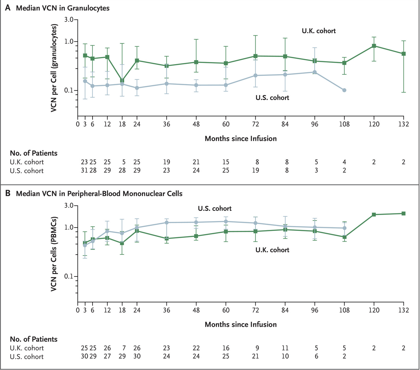 Figure 1: Median Vector Gene Marking in Granulocytes and Peripheral-Blood Mononuclear Cells. Shown is the median vector copy number (VCN) in granulocytes (Panel A) and peripheral-blood mononuclear cells (Panel B) from the first follow-up after infusion of the drug product (month 3) to the latest follow-up. 𝙸 bars indicate standard errors.