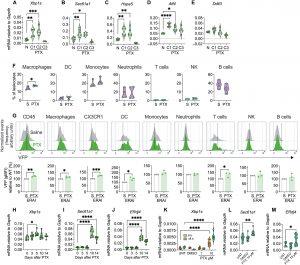 Figure 1: Paclitaxel activates IRE1α in immune cells in the peripheral nociceptive neuroaxis. (A to E) PBMCs from WT C57BL/6J mice (n = 6 or 7) were collected after paclitaxel (PTX) treatment on day 0 [cycle 1 (C1)], day 2 (C2), and day 4 (C3) or from naïve mice (N), and mRNA was measured by quantitative RT-PCR. (A) Xbp1s, (B) Sec61a1, (C) Hspa5, (D) Atf4, and (E) Ddit3. (F) Flow cytometry analysis of CD45+ immune cell subsets infiltrating the DRGs from ERAI mice treated with three doses of PTX (2 mg/kg, ip, on alternate days) or saline (S). n = 4; each n represents an independent cohort pooling four mice. (G) Representative histograms (gray, saline; green, PTX) and quantification of geometric mean fluorescence intensity (gMFI) for VFP expression in DRGs obtained by flow cytometry. Data are normalized to each cohort’s saline control (ERAI saline), which was given a value = 1. n = 4; each n represents an independent cohort pooling four mice. (H to J) DRGs from WT mice (n = 6 or 7) treated with PTX (2 mg/kg, ip, on alternate days) were collected at 0, 3, 5, 10, and 14 days posttreatment for RT-PCR quantification. (H) Xbp1s, (I) Sec61a1, and (J) ERdj4. (K) BMDMs (n = 6 to 8 replicates) were left untreated (UNT), vehicle-treated [dimethyl sulfoxide (DMSO)], or exposed to PTX (1 or 10 μM) for 6 or 18 hours, and Xbp1s expression was measured by RT-PCR. (L and M) BMDMs (n = 10 to 16 replicates) were treated as in (K), and expression of the indicated transcripts was assessed by quantitative RT-PCR, normalized to Gapdh. (L) Sec61a1 and (M) ERdj4. [(A) to (F) and (H) to (M)] Violin plots show median ± quartiles. (G) Data shown as means ± SEM. Statistical analysis: one-way ANOVA (Tukey’s test) for (A) to (E), (H) to (J), (L), and (M); two-tailed Student’s t test for (F) and (G); two-way ANOVA (Tukey’s test) for (K). *P < 0.05; **P < 0.005; ***P < 0.0005; ****P < 0.0001.