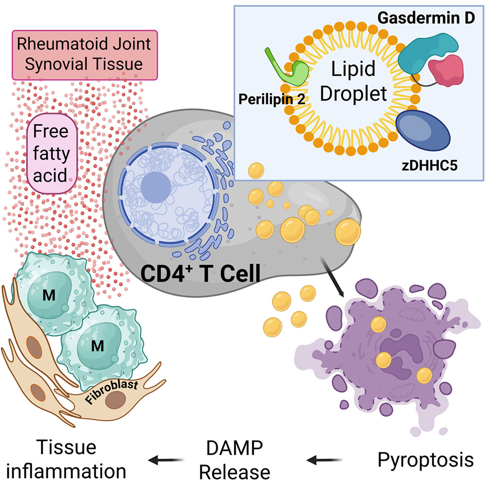 Exposure to fatty acids triggered rapid cell lysis in CD4+ T cells from RA patients through Pyroptosis, a form of programmed inflammatory cell death. During this process, lipid droplets helped transport gasdermin D to the plasma membrane, where it formed pores that caused the cell to rupture and release inflammatory molecules into surrounding tissue.