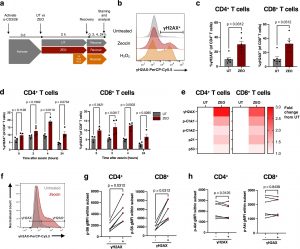 Figure 1: T cell DNA damage is associated with elevated mTORC1 activity. (a) DNA damage assay design. (b) Representative histograms of γH2AX levels by flow cytometry following 4-h recovery in untreated, zeocin-treated (200 μg/mL) and H2O2-treated (25 μM) PBMCs gated on CD4+ T cells. (c, d) Proportion of γH2AX+ of CD4+ (left) and CD8+ (right) T cells after (c) 4 h recovery from zeocin treatment, n = 6 healthy donors or (d) across different recovery times after zeocin treatment, from 4 independent experiments using PBMCs from 1 donor. (e) Heatmaps for levels of DDR signalling molecules expressed as fold change from untreated (UT) cells. (f) Representative gating of γH2AX+ and γH2AX− cells based on untreated (grey), zeocin-treated (red) cells, and fluorescence minus one (FMO, dotted grey) control. (g, h) Geometric mean fluorescence intensity (gMFI) of (g) p-S6 and (h) p-Akt in zeocin-treated CD4+ or CD8+ T cells gated as either positive or negative for γH2AX, n = 6 healthy donors. p-values are derived from a two-way ANOVA with Šídák’s multiple comparisons test (d), and a Wilcoxon matched-pairs signed rank test (c, g, h).