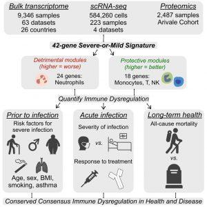 Why do some people get dangerously ill from infections while others recover quickly? Age, sex, smoking, and obesity have long been known to raise risk, but what connects these seemingly unrelated factors? In a new study researchers have uncovered a shared biological thread: a gene signature of immune dysregulation that can predict how severely a person will respond to infection even before they get sick (Figure 1).