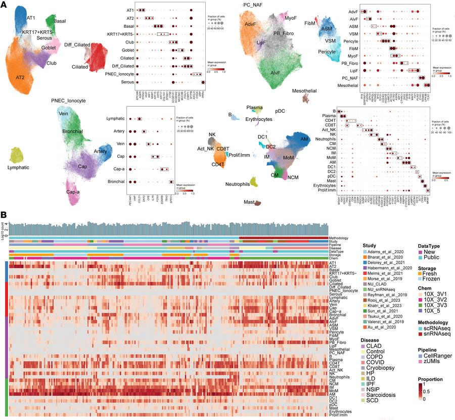 Figure 1: Integrated object of single-cell transcriptome from multiple datasets. (A) Uniform manifold approximation and projection (UMAP) plot displaying cell types, accompanied by a dot plot showing the expression levels of key marker genes. The expression level was z-score–transformed. AMs, alveolar macrophages; IM, interstitial macrophages; MoM, monocyte-derived macrophages. (B) Heatmap of cell type proportions across samples, where each row represents a cell type, and each column represents a sample. Diff_Ciliated, differentiating ciliated; PNEC_Ionocyte, pulmonary neuroendocrine cells and ionocyte; ASM, airway smooth muscle; VSM, vascular smooth muscle; FibM, fibromyocyte; LipF, lipofibroblast; PC_NAF, perichondrial or nerve-associated fibroblast; Cap, general capillary endothelial cells; Cap-a, capillary aerocyte; NCM, nonclassical monocytes; Act_NK, activated NK; pDC, plasmacytoid dendritic cells; Prolif.Imm, proliferative immune cells.