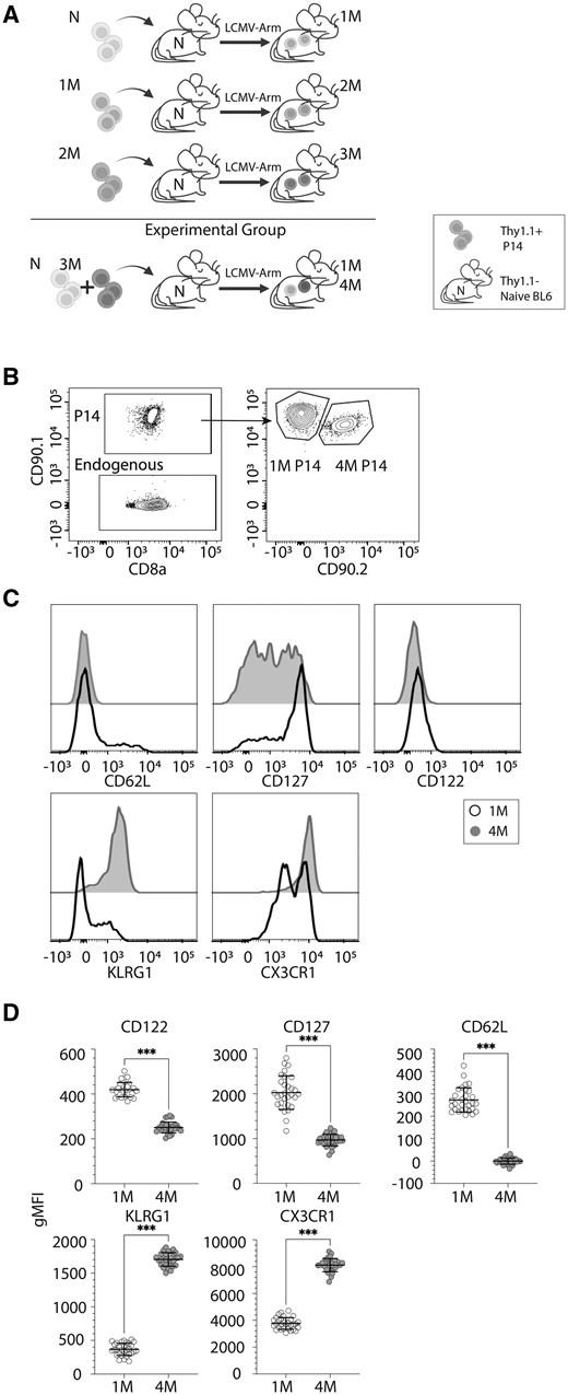 Figure 1: Generation of 1M and 4M CD8 T cell populations within the same host. (A) Experimental design. Naïve Thy1.1/1.1 and tertiary memory (3M) Thy1.1/1.2 TCR-Tg P14 CD8 T cells were co-adoptively transferred into naïve Thy1.2/1.2 C57BL/6 (B6) hosts at a ratio of 1:10, followed by LCMV-Arm (2 × 105 PFU intraperitoneally) infection to generate allelically distinct primary memory (1M) and quaternary memory (4M) populations. (B) Representative gating of TCR-Tg P14 and endogenous Thy1.2/1.2 CD8 T cells (left) and of 1M and 4M P14 CD8 T cells (right). (C) Expression of CD62L, CD127, CD122, KLRG1, and CX3CR1 on gated 1M and 4M P14 CD8 T cells. Representative histograms are shown. (D) Quantification of geometric mean fluorescence intensity (gMFI) of cell surface markers from panel C. Data are representative from at least 3 independent experiments with at least 5 mice per group. Error bars represent the SD of the mean. ***P < 0.001 using 2-tailed Student’s t test.