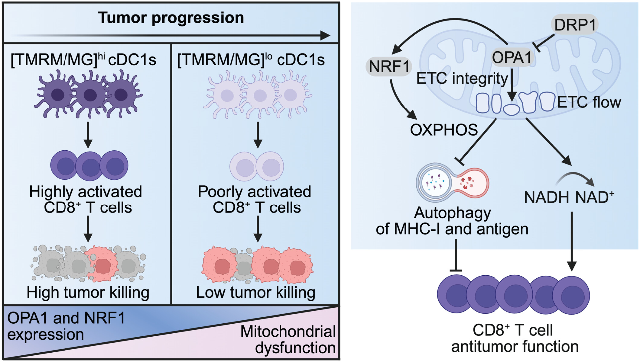 (Left) [TMRM/MG]hi cDC1s more effectively prime CD8+ T cell responses and control tumor growth compared with [TMRM/MG]lo cells. Intratumoral cDC1s undergo mitochondrial dysfunction and decreased OPA1-NRF1 signaling during tumor progression. (Right) The OPA1-NRF1 axis maintains OXPHOS to inhibit autophagy and lysosome–mediated degradation of MHC-I and antigen. OPA1-mediated ETC flow also supports cDC1 immunogenicity by balancing the NAD+/NADH ratio. These effects are antagonized by DRP1. [Figure created with BioRender.com].
