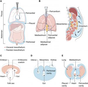 Figure 1: Development dictates the formation of serous cavities and associated immune adipose tissues. (A) The pericardial, pleural, and peritoneal cavities. The parietal mesothelium lines the cavity wall and reflects back over the organs in each cavity, where it becomes known as the visceral mesothelium; each cavity contains a small volume of lubricating serous fluid. (B) Each serous cavity contains FALCs in specialized adipose depots. Serous fluid circulates because of gravity and internal pressure changes in the cavities. (C) Developing embryo showing relationship between embryonic coelom that forms the serous cavities, the yolk sac that is the site of primitive hematopoiesis, the developing gut, and the heart. (D) Cross section through the peritoneal cavity and its association with abdominal organs including the kidney, uterus, and gut; the mesentery is indicated. (E) Cross section through thorax, detailing location of the pericardial cavity associated with the heart and the two pleural cavities enclosing the lungs; in mice, the pericardial and pleural cavities are interconnected by pores; the mediastinum is indicated. CREDIT: A. FISHER/SCIENCE IMMUNOLOGY.
