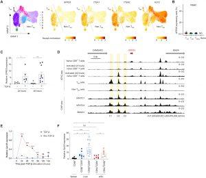 Figure 1: TGF-β induces expression of GPR25 in CD8 T cells. (A). Single-cell transcriptomes of human lung CD8 T cells from the DICE database (46), displayed using uniform manifold approximation and projection (UMAP). Seurat-normalized expression levels of the indicated transcripts in single cells are shown. The diagonal line represents the separation between TRM and non-TRM cells. (B) Bar plots showing the percentage of cells expressing GPR25 in circulating CD8 T cell subsets from the DICE database (46). (C) RT-qPCR analysis of GPR25 expression levels in naïve human CD8 T cells stimulated with anti-CD3 and anti-CD28 in the presence or absence of TGF-β for 24 and 48 hours. (D) UCSC genome browser tracks for genes in the extended GPR25 locus (50 kb), ATAC-seq tracks in the indicated CD8 T cell populations (top) and ENCODE chromatin immunoprecipitation sequencing tracks for NFATC1, NFATC3, and SMAD1 (bottom). C1, C2, and C3 cis-regulatory regions are highlighted. (E) Gpr25 expression levels in naïve murine CD8 T (CD8+CD44loCD62Lhi) stimulated with anti-CD3 and anti-CD28 in the presence or absence of TGF-β at the indicated time points. (F) Gpr25 expression levels in CD8β+ T cells (spleen), CD8β+CD69+ and CD8β+CD69− T cells (liver), and CD8α+CD8α + and CD8α+CD8β+ T cells (siIELs) isolated from unmanipulated WT C57BL/6J mice (>90 days old). Graphs in (B) depict median and interquartile range for each of the 18 donors across cell types. Graphs in (C) and (F) depict means ± SEM. Graphs in (E) depict means ± SD. (C), (E), and (F) are representative of two independent experiments (n = 5 to 11). Statistical significance was determined by two-tailed, unequal variance Student’s t test. ns, no significance.