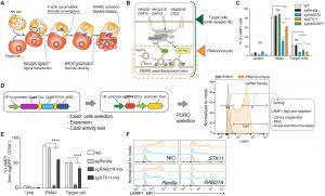 Figure 1: A genome-wide CRISPR KO screen to identify regulators of NK cell CG exocytosis. (A) Schematic of NK cell target cell recognition, lytic granule polarization, and killing function. (B) Differences in NK cell signaling events upon NK receptor ligation (K562 recognition/anti-NK receptor Ab, green) or chemical stimulation using PMA/I (orange). (C) Degranulation with indicated NK-92 cell lines comparing surface up-regulation of LAMP1 on unstimulated, PMA/I, and target stimulated cells. Bulk NK-92 cell lines were used for comparison. Data are shown as mean with SD. (D) Overview of FACS-based degranulation screen. Left: Generation of Cas9-expressing NK-92 cell line and consequent transduction with Brunello CRISPR library, selection, and expansion. Right: Exemplary FACS histogram showing gating strategy for LAMP1-stained PMA/I-activated NK-92 cells. LAMP1-negative (neg) and -high (hi) populations were sorted for further analysis of guide enrichment. Gating on the LAMP1+ (positive) population was used in all degranulation assays throughout this study to compare the efficiency. (E) Degranulation assay for NK92 Cas9-BFP cells transduced with lentiGuide. Puro vectors encoding control guides for Renilla, RAB27A (mix of three guides), and STX11 (mix of three guides). (F) Representative histogram stacks comparing surface LAMP1 up-regulation by noninfected cells (NICs) and sgRenilla, sgRAB27A, and sgSTX11 NK-92 cells quantified in (E). Data are shown as means ± SD and representative of at least two independent experiments. P values were calculated by two-way ANOVA with Bonferroni correction. Unstimulated (w/o, gray); stimulated with PMA/I (orange) or target cells (blue). *P < 0.05, ***P < 0.001, and ****P < 0.0001. ns, not significant.