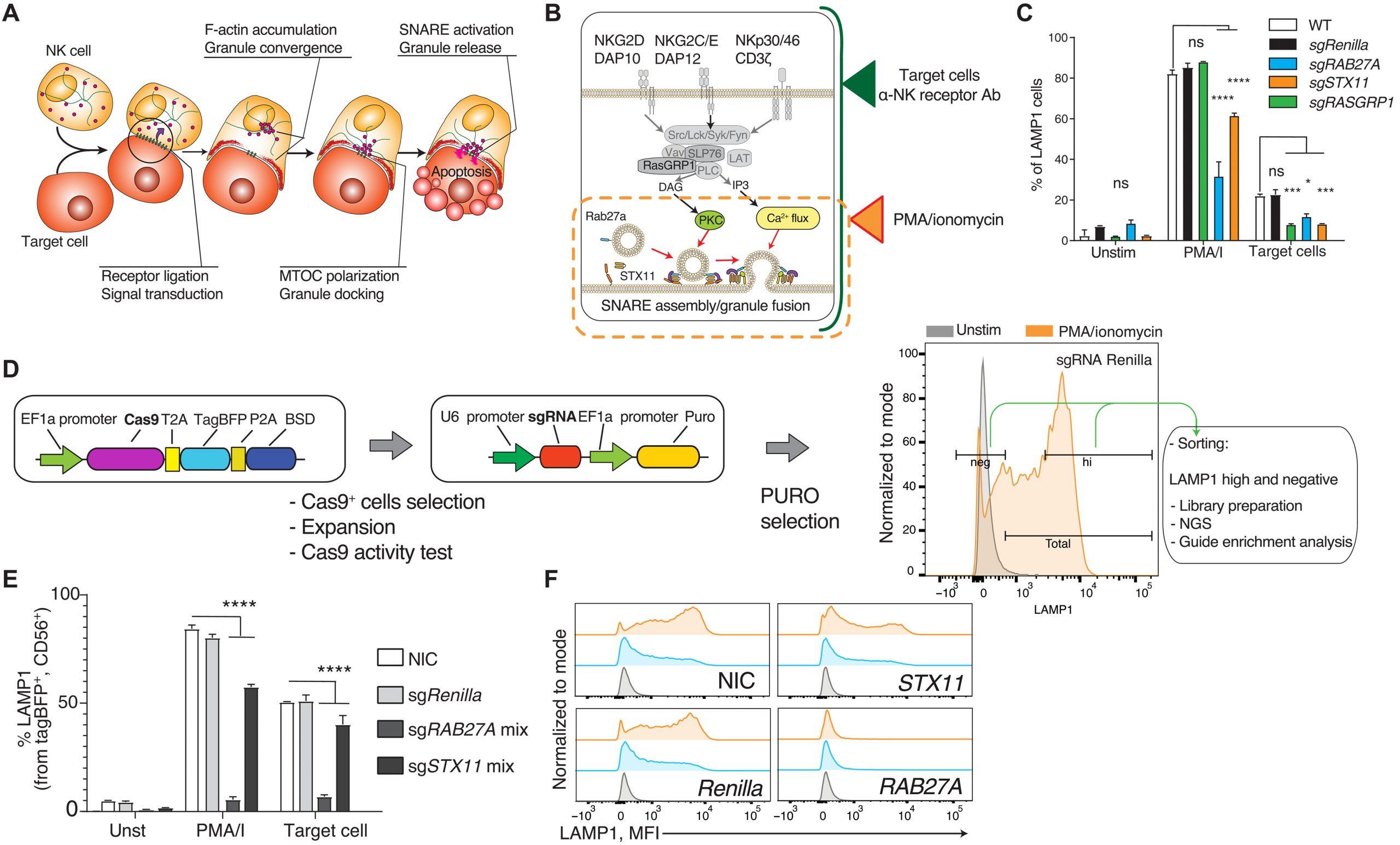 Figure 1: A genome-wide CRISPR KO screen to identify regulators of NK cell CG exocytosis. (A) Schematic of NK cell target cell recognition, lytic granule polarization, and killing function. (B) Differences in NK cell signaling events upon NK receptor ligation (K562 recognition/anti-NK receptor Ab, green) or chemical stimulation using PMA/I (orange). (C) Degranulation with indicated NK-92 cell lines comparing surface up-regulation of LAMP1 on unstimulated, PMA/I, and target stimulated cells. Bulk NK-92 cell lines were used for comparison. Data are shown as mean with SD. (D) Overview of FACS-based degranulation screen. Left: Generation of Cas9-expressing NK-92 cell line and consequent transduction with Brunello CRISPR library, selection, and expansion. Right: Exemplary FACS histogram showing gating strategy for LAMP1-stained PMA/I-activated NK-92 cells. LAMP1-negative (neg) and -high (hi) populations were sorted for further analysis of guide enrichment. Gating on the LAMP1+ (positive) population was used in all degranulation assays throughout this study to compare the efficiency. (E) Degranulation assay for NK92 Cas9-BFP cells transduced with lentiGuide. Puro vectors encoding control guides for Renilla, RAB27A (mix of three guides), and STX11 (mix of three guides). (F) Representative histogram stacks comparing surface LAMP1 up-regulation by noninfected cells (NICs) and sgRenilla, sgRAB27A, and sgSTX11 NK-92 cells quantified in (E). Data are shown as means ± SD and representative of at least two independent experiments. P values were calculated by two-way ANOVA with Bonferroni correction. Unstimulated (w/o, gray); stimulated with PMA/I (orange) or target cells (blue). *P < 0.05, ***P < 0.001, and ****P < 0.0001. ns, not significant.