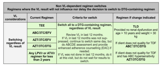 Figure 2 Non-Viral load dependent regimen switches. As the patients’ viral load is unknow at the time of presentation, according to the new guideline the patient would be switched to TLD1 or TLD2.(Standard Treatment Guidelines and Essential Medicines List for South Africa, 2023)