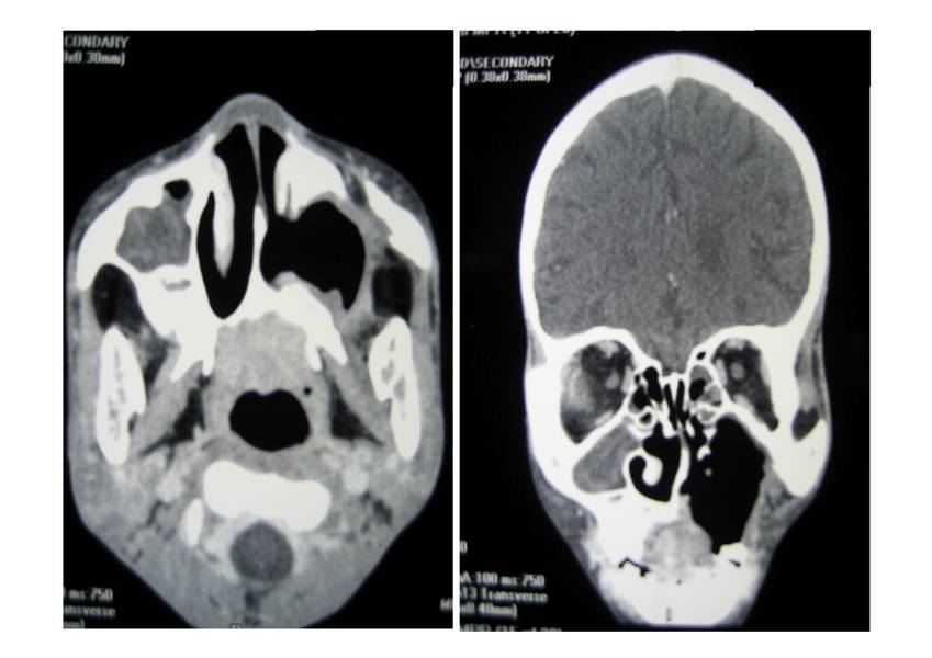 Six months ago she had been admitted to her local hospital following a 5 day history of swollen painful gums with painful swelling of the left upper jaw and cheek. She was diagnosed with acute necrotising ulcerative gingivitis (cancrum oris).