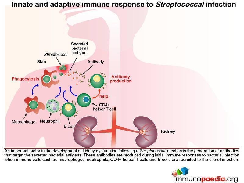 Innate immune cells such as macrophages and neutrophils migrate to sites of infection and help to destroy bacteria. The adaptive immune system is also activated with the recruitment of CD4+ helper T cells and B lymphocytes responding to bacterial antigens. An important factor in the development of kidney dysfunction following a Streptococcal infection is the generation of antibodies that target the secreted bacterial antigens .