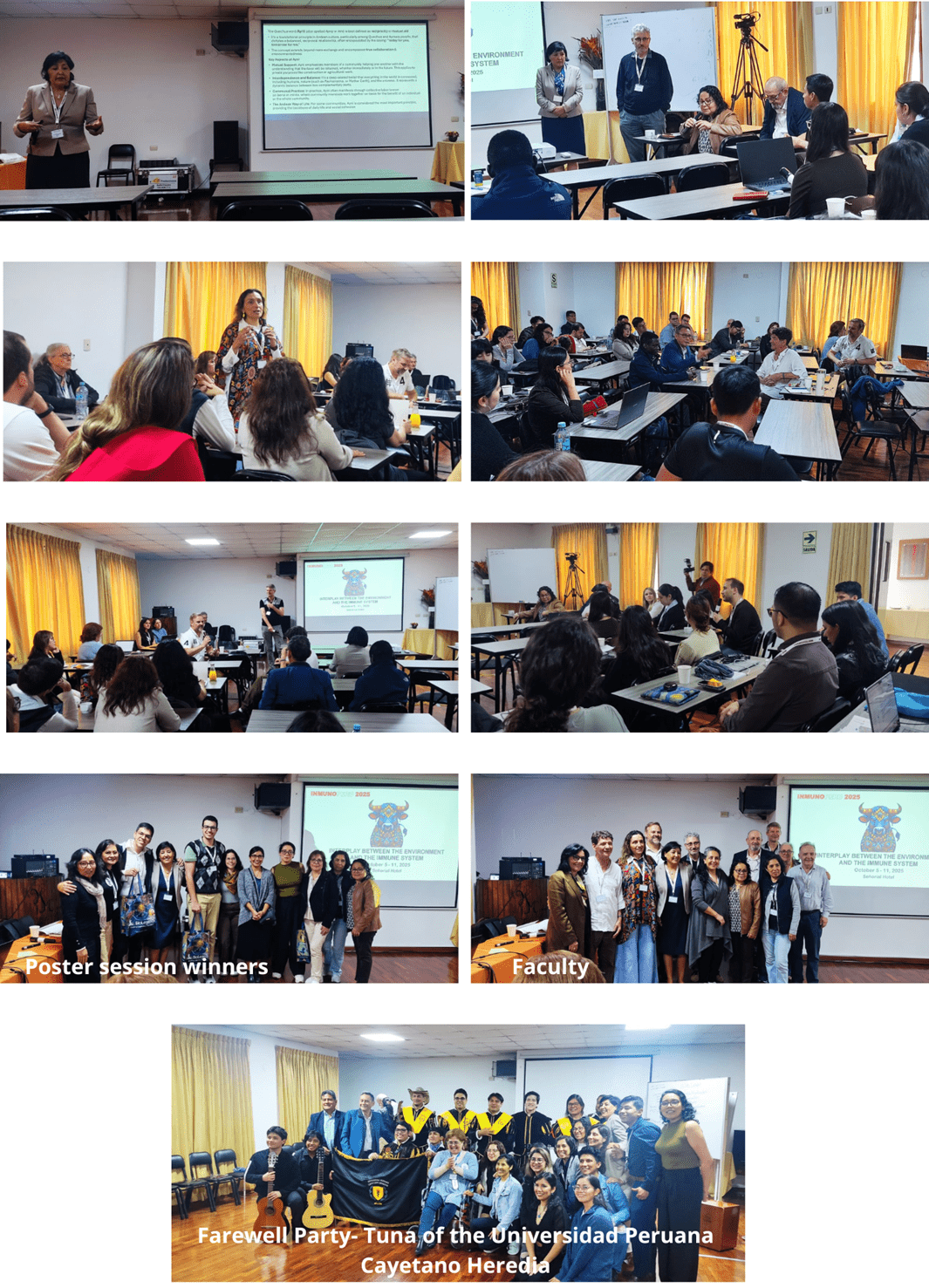 As evening arrived, the farewell dinner gathered participants and faculty in a friendly atmosphere. The evening was accompanied by the Tuna of the Universidad Peruana Cayetano Heredia, whose performance added a touch of cultural tradition to the closing ceremony. The program concluded with a shared commitment to maintaining the professional and scientific networks established during ImmunoPeru 2025.