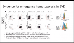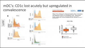 McElroy presented data that demonstrated that severe disease and high viral load is associated with T cell activation, B cell expansion and monocyte redistribution as well as alterations in dendritic cells. These findings provide clues as to why EVD is so severe. Specific differences observed during EVD pathology compared to controls were: